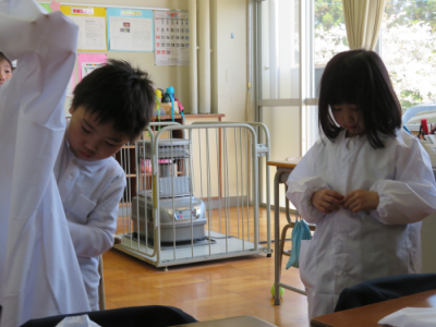 4月22日(月),1年生は4限目の学習で給食準備の練習をしました。白衣を着るのはこれが初めてで,子どもたちからは「ボタンが小さくてうまくつけれないよ」「上手にたたむのが難しいな」と声が聞こえてきました。
