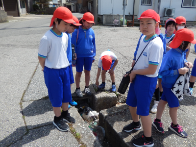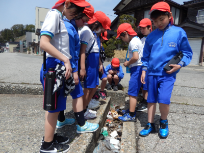 海に浮かんでいたり,海岸に打ち上げられているのはもちろん,町中の溝にもたくさんのごみがあることが分かりました。その中で子どもたちは「雨が降ったらこの溝にあるごみは…海へ流れる?」「ぼくたちが捨てているごみは最後は海へいくのかな」と新たな気づきを持ちました。