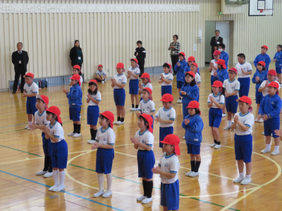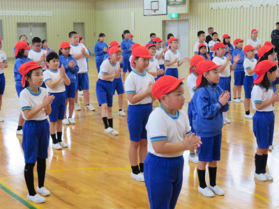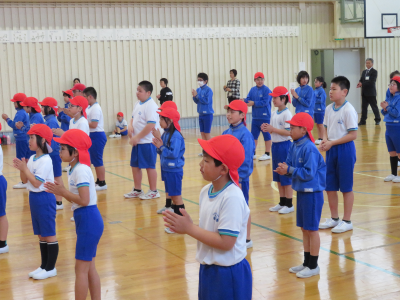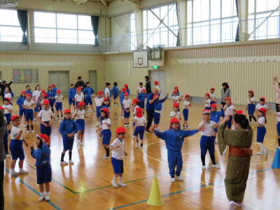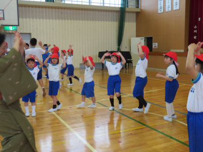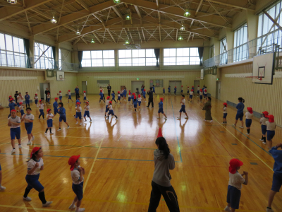 練習の後半には,イカチーム・クジラチーム・マンボウチームで円を作り,本番と同じように踊りました。外から見ていると動きが揃っていくにつれて子どもたちが一体となっていく様子が伝わってきました。