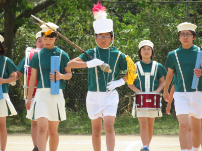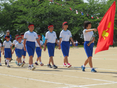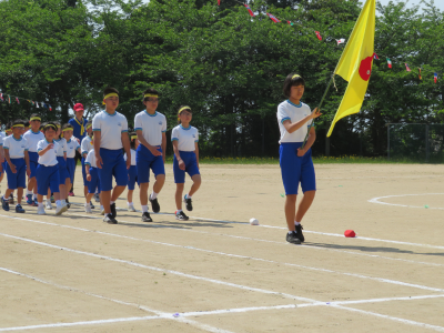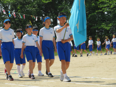 入場行進では各チームのリーダーを先頭に全学年が行進しました。リーダーの掛け声に応じて「おー!」と元気よく声を出していたのが印象的です。