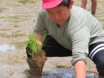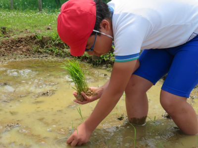 実際に田植えが始まると,6年生は昨年の経験が生きており,素早く正確に田植えを行っていました。5年生は初めて入る田に悪戦苦闘していましたが,徐々に慣れてくると丁寧に田植えをしていました。