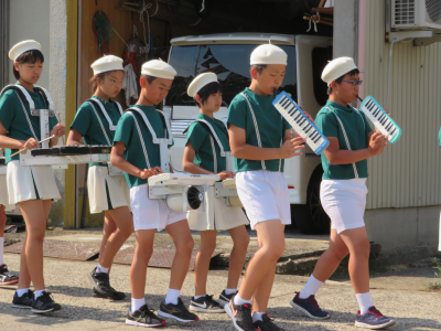 イカす会の始まりを告げるパレードでは,運動会で披露した曲を演奏しながら小木の町を練り歩きました。30分間という長い時間でしたが,子どもたちは最後までしっかりとやり切ることができました。沿道に立って声援を送ってくださった保護者の方々や地域のみなさま,本当にありがとうございました。