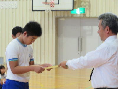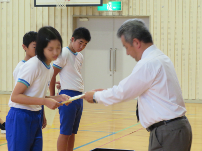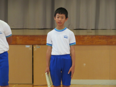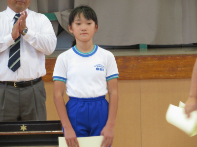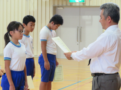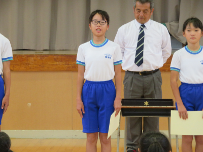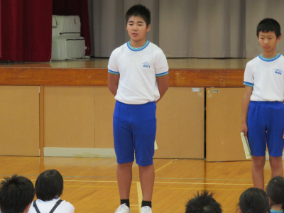 児童朝会で後期委員会の委員長の任命式が行われました。