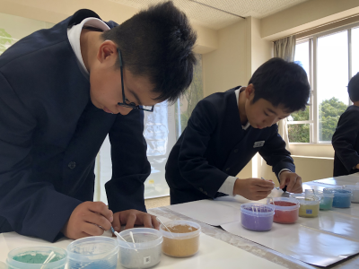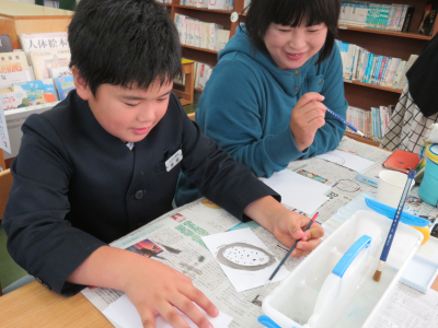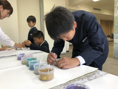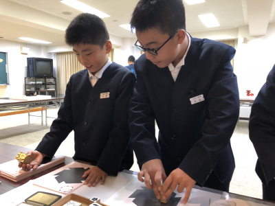 漆のスタンプを用いて行ったストラップ作りでは,漆をのりの代わりにして自分たちの好みの色の金粉で色付けました。