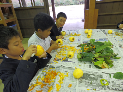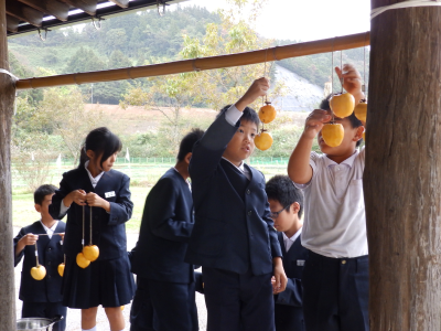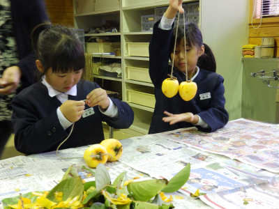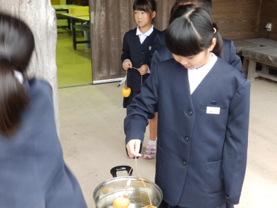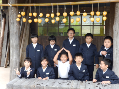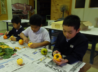 4年生が真脇遺跡体験館にて干し柿づくりに挑戦しました。