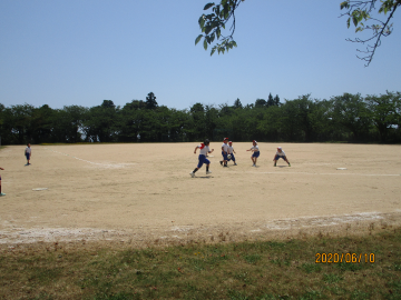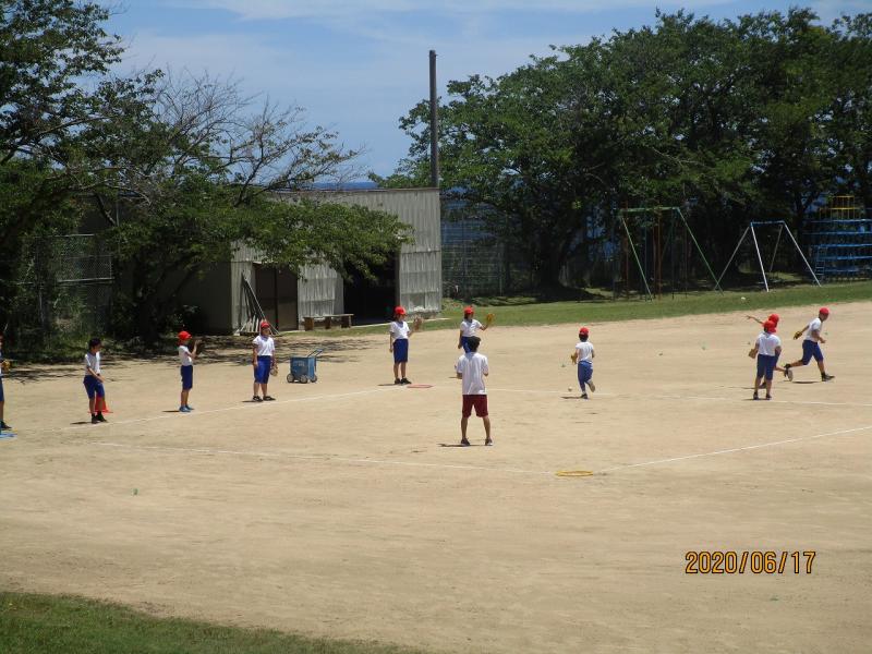 6年生の体育、ベースボール型ゲームの授業です。キャッチボールをしています。
