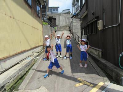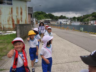 2年生は生活科で町探検に出かけました。今日は漁港の方へ歩いて行きました。イカ釣り漁船で働く人たちや、道で出会ったおじいさん、おばあさんに元気に挨拶できました。海がキラキラ光ってきれいでした。「小木の町のすてき」を発見できました♪