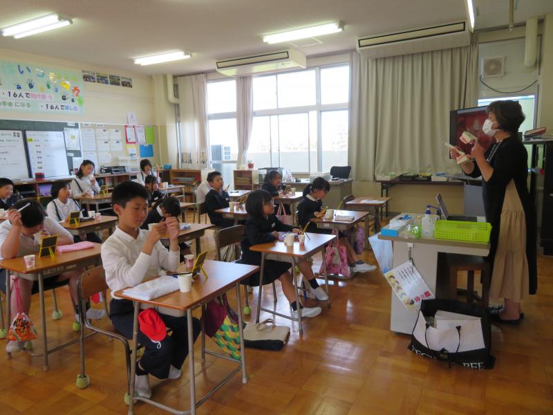 4・5年生を対象に歯みがき教室を行いました。 歯科衛生士の先生から、「かむことの8つのいいこと」「はみがきのポイント」を教えていただき、歯垢の染めだしを行いました。