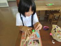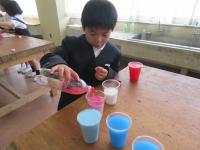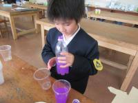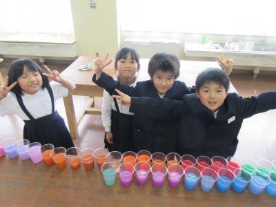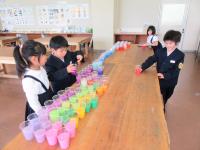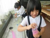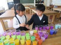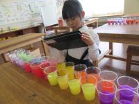 1年生は図工の時間、色水作りを楽しみました。ペットボトルに絵の具と水を入れて、フルフル振ると、きれいな色の色水ができました。「きれい!」「すごい!」たくさんの色水を作り、工夫して並べることができました。