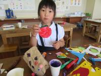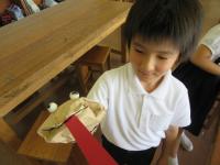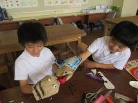 1年生は図工の時間、紙袋や紙コップを使って、ぱくぱくすると楽しいお友達を作りました。紙袋をくしゃくしゃにして、思いついたものを表すことが上手にできました。作った後、ぱくぱくさせて遊びました。