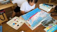 6年生は図工の時間、小木漁港の絵を描いています。大切な風景を、思いが表れるように工夫して絵に表しています。皆やさしい色で、やさしいタッチで塗り進めています。完成が楽しみです♪