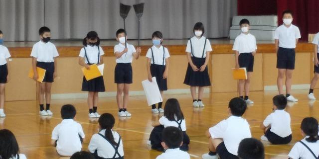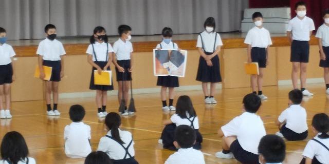 本日、児童集会がありました。整美委員会から掃除用具の正しい片づけ方について実物を使って説明がありました。