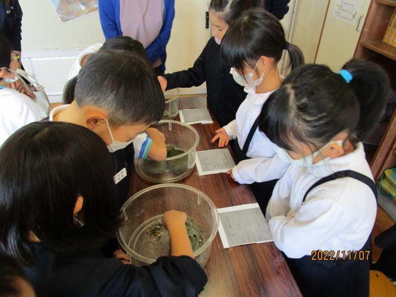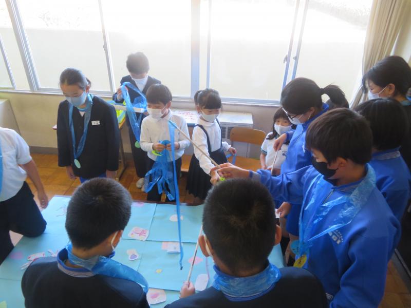 2年生生活科の学習で「2年生スペシャル水族館」を開きました。4時間目は1年生に育てている生き物を紹介したり、手作りのゲームで遊んだりしました。昼休みは全校児童を招待しました。生き物とふれ合ったり、ゲームを楽しんだりしていました。