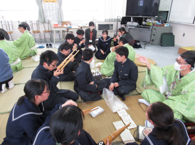 能登町の酒垂神社雅楽会のみなさんにお越しいただき、雅楽の演奏を聴いた後、生徒たちも実際に演奏させていただくことができました。とても貴重な体験になりました。お忙しいなか、お越しくださいました酒垂神社雅楽会のみなさま、ありがとうございました。