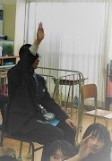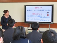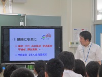 避難訓練の後,防犯講義も行われました。学校の登下校など学校の外で不審者に出会ったとき,どのように対応するかなど,詳しく教えていただきました。「い・か・の・お・す・し」の復習や護身術の実技について教えていただき,生徒からは「改めて不審者の対応について学ぶことができてよかった」「こども110番の家を確認しようと思った」などの感想がありました。