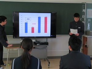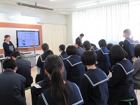 次に,2年生の山本さんと高さんから,修学旅行の「東京大空襲・戦災センター」で学んだことの発表がありました。「戦争から74年が経ち,被災された語り部の方々も高齢化している中,話を聞いた私たちが次世代に伝えていかなければならないと強く感じた」という感想がありました。