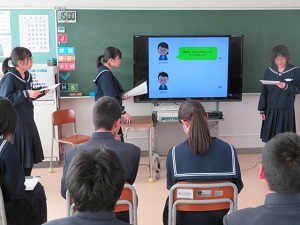 ゲームの後,生徒を代表して3年生の谷口さんが英語で「サラ先生との英語の授業は楽しかったです。おかげで私たちは英語がとても上手になりました。医者になるという素敵な夢が叶うようにがんばってください」と伝えました。サラ先生からは「短かったけど,小木中でみんなと勉強できて楽しかったです。これからも英語の勉強を続けてください。」というメッセージをいただきました。