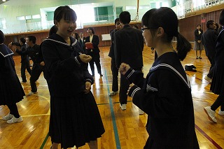 先月から5月の“とも旗祭り”に向けての準備が始まりましたが、8日は柳田中学校の生徒との共同作業を行いました。初めはお互い緊張して口数も少なかったのですが、作業が進むにつれにぎやかになり、柳田中学校の生徒が帰るころにはお互いが笑顔で手を振る様子がみられました。これから木曜日ごとに旗を作っていきます。5月が楽しみです。