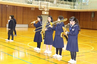 9日(月)、ブラスバンド部が昼休みの時間を利用して、ミニコンサートを開いてくれました。初めは1年生を対象にと考えられたコンサートでしたが、3年生も多数参加するなど、賑やかな会となりました。