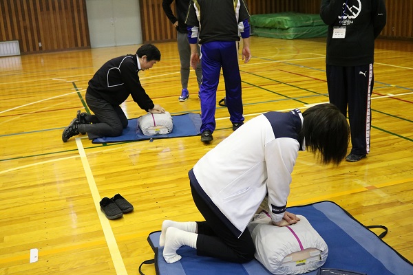 放課後は、教職員のAED講習会。生徒の命を守るために教職員も研修に励んでいます。