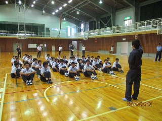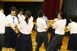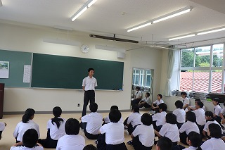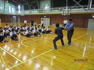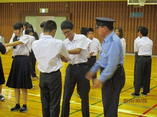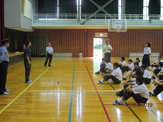 6月29日の4限目、珠洲警察署と小木駐在所に協力をしていただき、不審者が校内に侵入した場合の避難訓練と、もし、不審者に捕まえられたら、どうやって逃げるかについての講習会を行いました。不審者の目につかないように避難する方法や、不審者に腕や体をつかまれたときに、どうやって振り払うか、実技を交えながら話を聞きましたが、生徒個々の問題もさることながら、