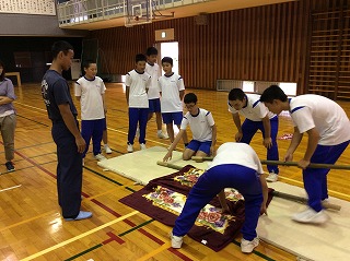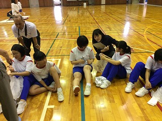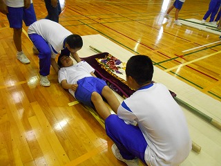 5日(木)は消防署内浦分署の職員の方々をお招きし、身の周りのものを利用して応急処置をする方法やけが人の運搬方法について学習しました。能登町にには救急車が4台しかなく、大災害が起こった場合、救急車がくるまでに4時間ほどかかる場合もあり、軽いけがは自分たちで処置できるようにしておく必要もあります。また、動けない人を安全な場所に移動させる場面も考えられます。自分たちでできることはできるようにしておきたいと改めて感じました。