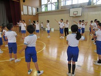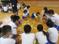 防災学習では,まず,防災体操を教えて一緒にしました。事前学習で打ち合わせをしていたのですが,小学生になかなか上手く伝えられないグループもあり「教えるというのは難しい!」という声も聴かれました。次に防災カルタをしました。小学生がカルタを楽しめるようにサポートすることができました。最後に、高学年と一緒に新聞紙を使って箱とスリッパをつくる練習をしました。10月6日には、地域の方々にしっかりと教えたいですね。