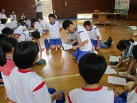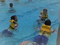海上保安暑の職員の方に、仰向けでの浮き方やペットボトルを使った救命法などを教えていただきました。また、ライフジャケットを着用することで楽に浮くことができることも学びました。