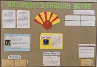 ALTのトム先生は,毎月その月のアメリカの風習にちなんだ掲示コーナーをつくってくれています。今月は下の写真のように「Thanksgiving day」がテーマでした。アメリカでは大統領がThanksgiving dayの朝に2羽の七面鳥を恩赦するそうで、掲示コーナーの色あでやかな鳥は七面鳥だそうです。