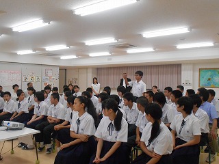 12日(木)、能登町立宇出津病院から看護師の上野真由美さんをお招きし、看護師という仕事の内容やなぜ看護師になろうとおもったのか、その仕事のやりがいについて話して頂きました。また、よくつかわれる医療器具を実際につかう体験もさせてもらいました。3年生は将来、自分がどんな職業をめざすのか、そのためにはどんな勉強や準備が必要なのかを高校選択と併せて考えていかなくてはならない時期に入っています。この日のお話や体験もとても勉強になるものでした。