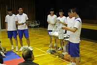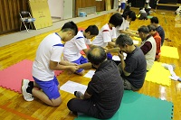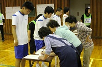 避難して来られた方の受付 防災体操の披露(全校生徒)