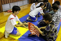 風呂敷を使った簡易リュックの 応急処置の仕方の説明(2年)