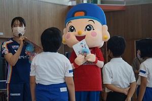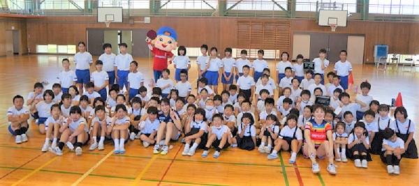 卓球台贈呈式では、マスコットキャラクターのマレットちゃんと一緒に全校がクイズ大会を楽しみました。
