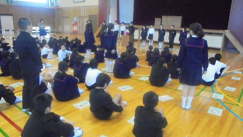 寒かったので防寒をして集まりました。いつものように元気に校歌を歌い、ふり返りをみんなの前で発表し、有意義な集会でした。