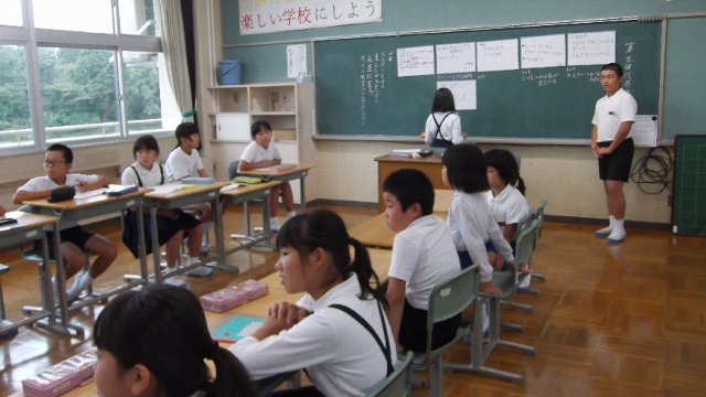 委員会や各クラスの代表が集まり、1学期の学校生活を振り返り、2学期につなげる話し合いをしました。学年に関係なく堂々と意見を言えていました。授業のようにホワイトボードを活用して一人ひとりの意見を大切に話し合いました。