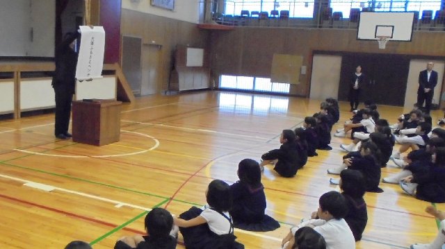 全校集会の後は、後期児童会役員の任命式でした。良い学校、楽しい学校づくりのため高学年ががんばってくれます。発表では、4年生がペットボトルキャップ回収ボックスを作ってくれたお知らせと図書委員会からのミニシアターでした。とっても充実した二つの発表でした。