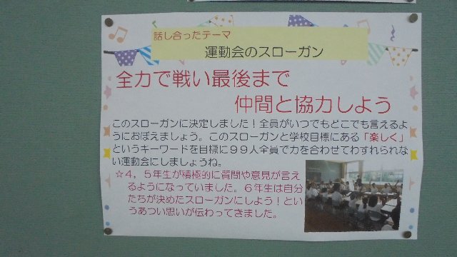 クラスの代表や委員長を中心として児童会代表委員会が行われています。昼休み、児童会室で今月は運動会のスローガンを決めています。たくさんいますね、代表と言うより「直接民主制」に近いかも。(笑)