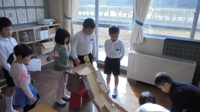 こども園の年長さんが1・2年生に招待されて学校へやってきました。ダンスやゲーム、精一杯のもてなしを受けて楽しそうでした。しばらく見ないうちにみんな大きくなっていましたよ。冬が終われば大海小に入学です。