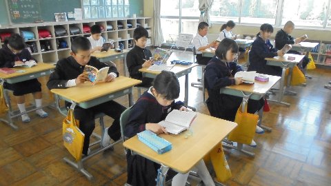 朝学習の様子です。1週間の始まりは、心落ち着け読書でスタートしています。司書の田中先生が順番に各教室を読み聞かせで回って下さいます。