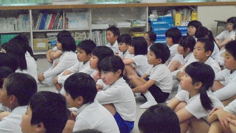 今年初めてのお話会は、全校で聞きました。今年もやまんばグループの北本さん達が来て下さいました。季節にぴったりのタケノコのお話でした。とってもスケールが大きくて面白かったです。写真の表情を見て下さい。どの子も真剣、その中に笑い声の反応があり、あっという間の時間でした。