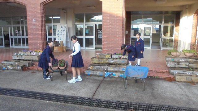 雪が降る前にと思い、子ども達が登校している学期中にいくつかのプランターを玄関にセットしました。葉ボタンがとてもきれいです。他のものは休業中で子どもたちが休みなのであわてません。十分日の当たるところでぎりぎりまで育てます。アドバイザーの助言通り。