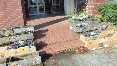 玄関の草花は、子どもたちのボランティアのおかげで難を逃れました。このあと5.6年生がもとに戻してくれます。