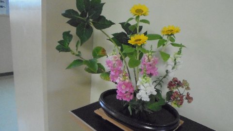 左から城村先生の写真、葛葉さんの押し花、林さんの折り紙、細川先生の生け花・・・ありがとうございます。