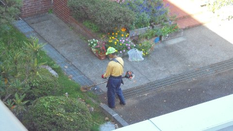校地の草を管理公社の皆さんに刈り取ってもらっています。夏休み奉仕作業はグランドの草がターゲットでしたが、今回はフェンスまわりの草むらを・・・蛇のすみかが無くなって安心、子どもたちの大好きなバッタのすみかも・・・大変です。(笑)