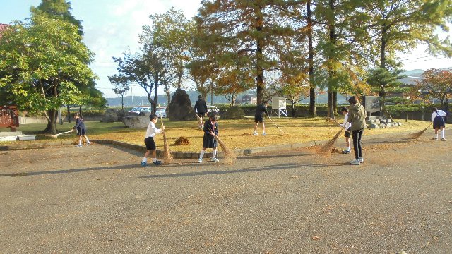 今週、管理公社の皆さんが校地の除草作業に入って下さいました。校庭の桜は色づき、校地のいたるところで落葉が始まっています。その落ち葉も掃いて下さいました。しかし、これからが本格的な落ち葉のシーズンです。今日から子どもたちに落ち葉はきをがんばってもらいます。早速長休みに1.3.5年生がちょこボラで前庭そうじに取り組んでくれました。別記事でお知らせしますね。
