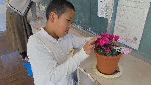 今日も生け花ボランティアの細川さんが来校して下さいました。明日の卒業式に合わせて、いつもよりたくさん花を持ってきて下さいました。