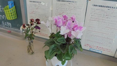いつもの玄関の分に加え、各控え室に飾る分も生けて下さいました。きれいな花がたくさん、明日ははなやかな大海小卒業式になりそうです。