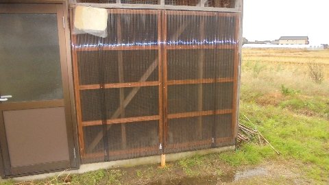 先日、網の面に波板をはり冬支度防寒を施しました。これからの寒さを少しでもしのげることができればと思います。外から見えにくくなりましたが、ドアを開けたらこんにちはです(笑)