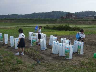東憲治さんを始め、中沼生産組合の皆さんから、苗の植え方を教えて頂きながら