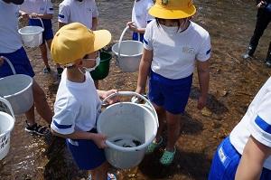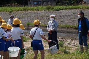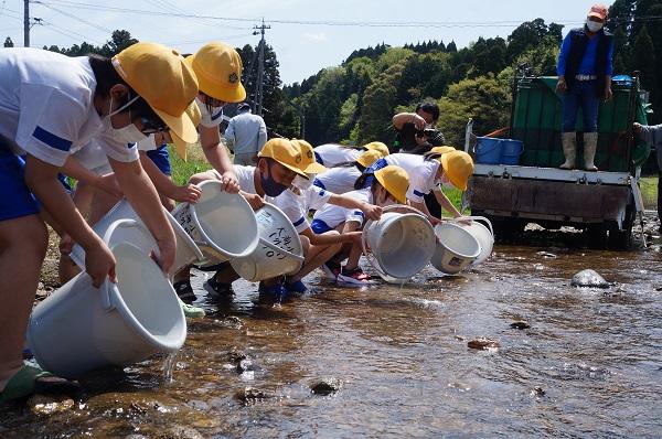 4月25日 青空が広がる中、4年生は大海川でサクラマスの稚魚の放流をしました。
